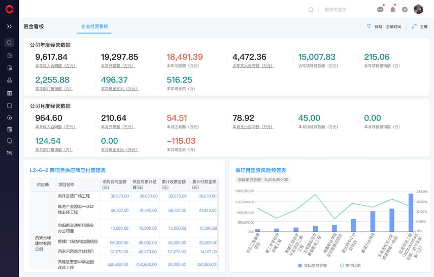 紅圈解決方案:紅圈系統具備全面的資金管理解決方案,通過系統,老板能夠及時、準確地知道公司每個在建項目的應收和實收情況、供應商的結算情況,以及過程資料是否有缺失,從而評估是否可能產生額外墊資,判斷對下付款是否有必要做壓款,項目墊資是否存在風險。財務也可以通過數據來判斷風險,給到老板更好的建議。
