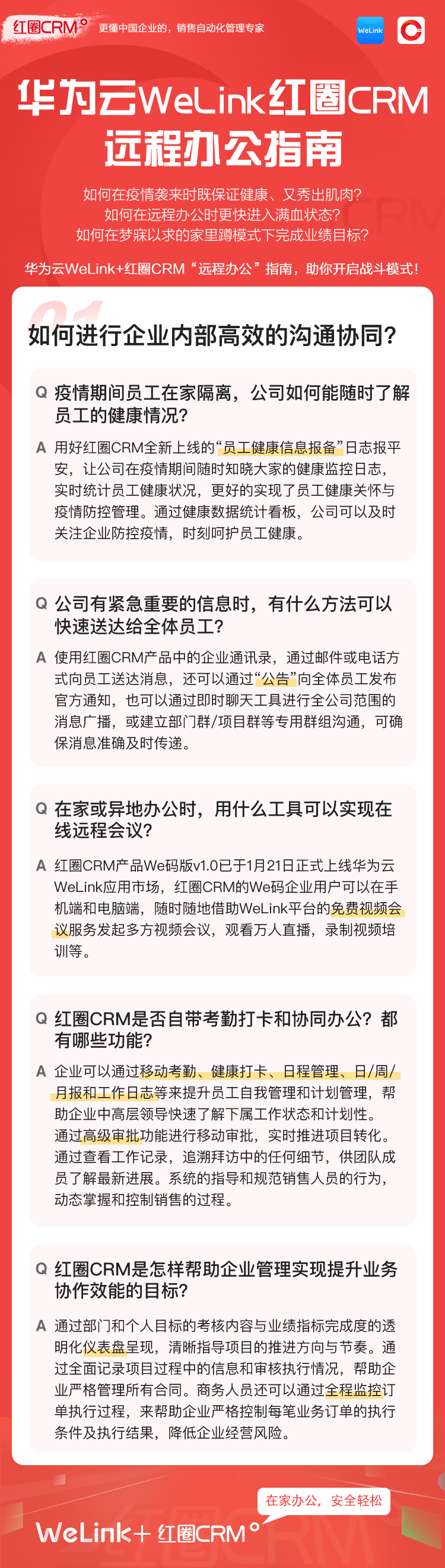 如何讓在家辦公安全、輕松、高效?華為云WeLink攜手紅圈CRM提供了安全、智能、開放的移動辦公解決方案,并提供免費的在線視頻會議服務,請您收好這份遠程移動辦公寶典!