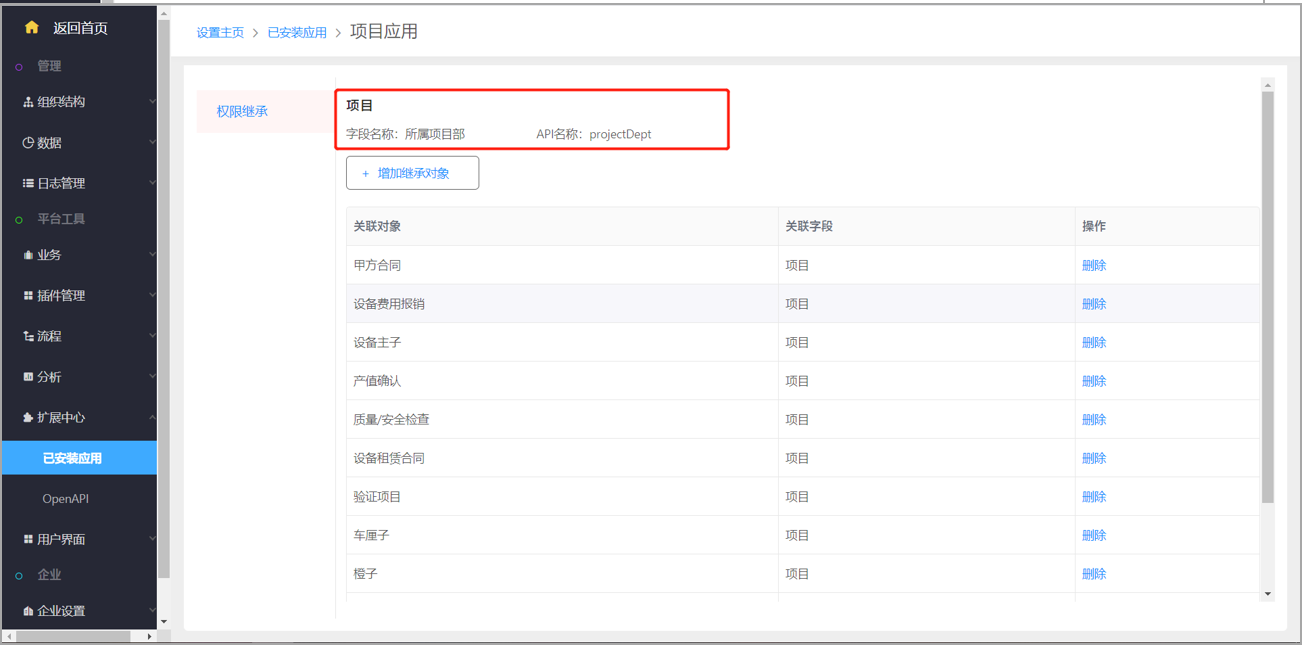為實現(xiàn)項目及其相關(guān)對象的矩陣型權(quán)限控制,以及相關(guān)對象與項目權(quán)限的一致性,v2101 在權(quán)限管理上進一步推出了項目多維度和權(quán)限繼承能力,擴展中心新增項目應(yīng)用。此應(yīng)用為項目及相關(guān)對象插入部門字段,結(jié)合項目型組織,實現(xiàn)對象雙部門結(jié)構(gòu),雙權(quán)限體系,保證項目下相關(guān)對象的數(shù)據(jù),在項目部門維度下,與項目保持一致。如果員工A是項目1的成員就可以通過此功能快速設(shè)置獲得項目1下所有對象的相關(guān)信息而不需要通過添加跟進人的形式進行權(quán)限設(shè)置。