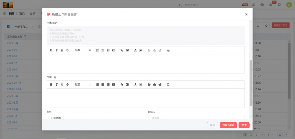 新建工作報告、查看工作報告,在總結字段上方默認展示上次報告計劃字段的內容