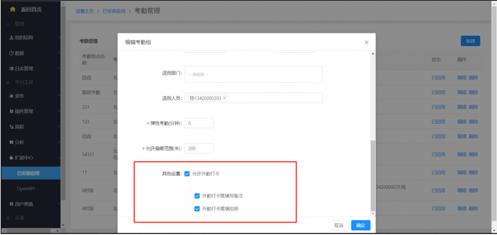 固定班制考勤設置,增加了是否允許外勤打卡設置(線上升級后默認允許),并增加了外勤是否必須拍照或必須填寫備注