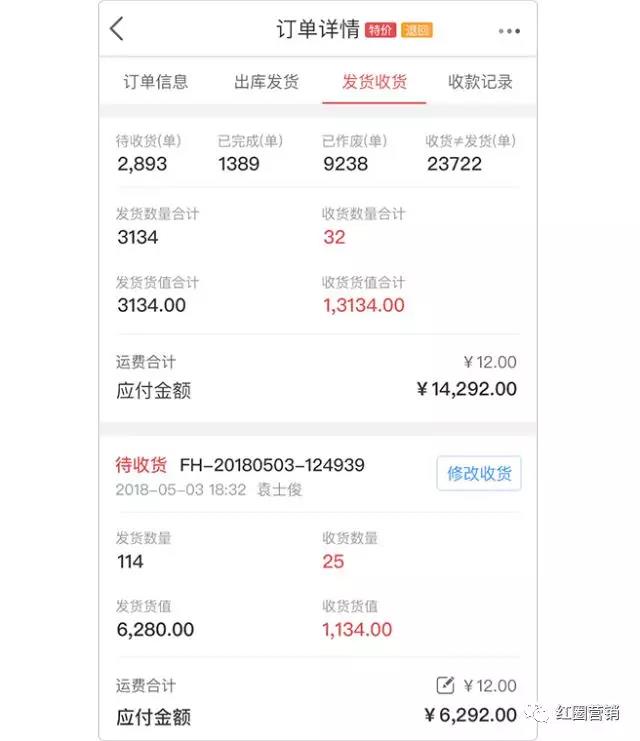 在出貨進貨中,由于運輸損耗等原因,企業(yè)發(fā)貨數(shù)量與客戶收貨數(shù)量不同的情況時有發(fā)生,為了便于處理類似的情況,紅圈通特別在訂單詳情頁增加發(fā)貨收貨記錄,支持分別記錄發(fā)貨收貨數(shù)量、單價、金額。
