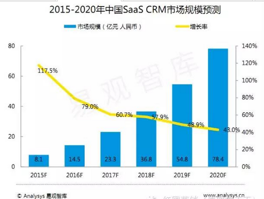 報告指出,國內SaaS CRM市場在2014年的增長率達到了176.9%,市場規模從1.3億元人民幣增長到了3.7億元人民幣,2015年的增長率預計達到117.5%,市場規模增長到8.1億元人民幣。2015-2020年市場還會保持較高速度增長,但是隨著市場規模的逐漸擴大,增長將趨于平穩,中國傳統中小企業的互聯網化轉型將成為市場規模增長的主要動力,而隨著中國傳統中小企業互聯網化轉型的逐漸完成,SaaS CRM市場的企業數量將保持在一個平穩的水平,市場的規模增長將來源于更加專業以及更加多元化的產品服務。