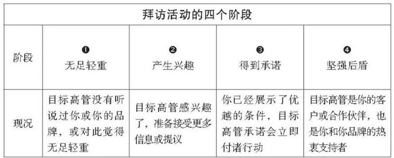 拜訪活動(dòng)剛開始,你的目標(biāo)高管要么就是不知道你或你的公司的存在,要么就是隱約地聽說過,但對(duì)你或你的品牌毫無印象。他們會(huì)覺得你無足輕重,覺得你是陌生人,或者比這個(gè)更糟糕——目標(biāo)高管對(duì)你或你的公司抱有負(fù)面印象。在這種情況下,外部的措施會(huì)對(duì)你有幫助,比如在社交媒體上的建樹、寫作和宣傳。這些工作加在一起能幫你改變目標(biāo)高管對(duì)你的負(fù)面印象,從而讓你更有可能與他們建立起更有意義的關(guān)系。銷售拜訪的首要功能就是幫你打通這個(gè)拜訪階段并走向下一步。