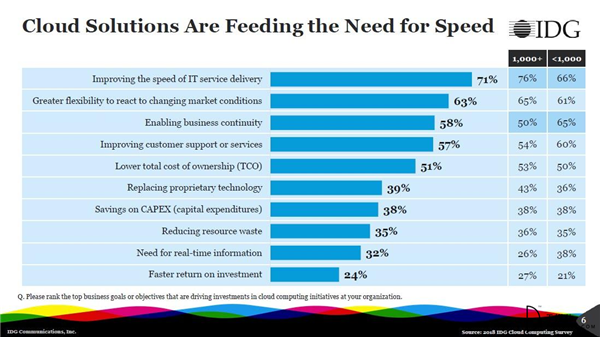 76%的大型企業(yè)正在尋求云應(yīng)用和平臺以加速IT服務(wù)的交付。多年來,云計算已經(jīng)被視作是一個降低成本的優(yōu)先策略,現(xiàn)在它已經(jīng)成為數(shù)字化業(yè)務(wù)模式的推動者。IT部門要求快速交付云應(yīng)用及平臺組件的期望與壓力從未如此之高。而云投資的目的是為企業(yè)帶來更大的靈活性,以及它們對不斷變化的市場環(huán)境做出反應(yīng)的能力(63%的全體受訪者對此表示同意),從而推進(jìn)數(shù)字化業(yè)務(wù)模式的實(shí)現(xiàn)。