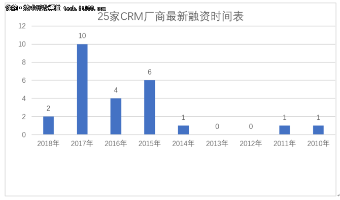 77家網(wǎng)上公開(kāi)資料搜索到的CRM廠商中有25家是有明確的融資情況,從上圖我們可以看出資本越來(lái)越青睞于CRM領(lǐng)域,最新融資情況在2015年-2017年內(nèi)的廠商共有20家,占比為80%,商業(yè)模式的成熟、企業(yè)CRM認(rèn)知的提高以及市場(chǎng)需求或許是資本青睞的主要原因。