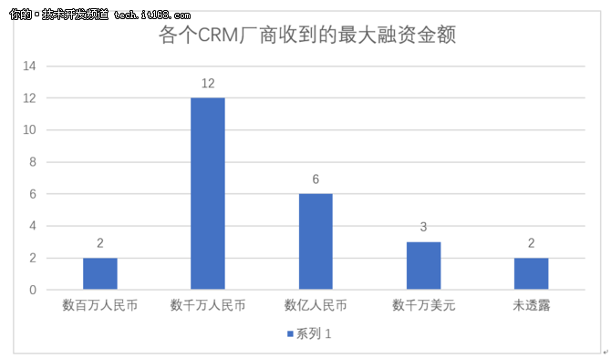 上圖總結(jié)了25家CRM廠商收到的最大融資金額, 我們將融資金額分為“數(shù)百萬(wàn)人民幣”、“數(shù)千萬(wàn)人民幣”、“數(shù)億人民幣”、“數(shù)千萬(wàn)美元”以及未透露五個(gè)類(lèi)別。其中12家公司收到最大的融資金額是數(shù)千萬(wàn)人民幣。