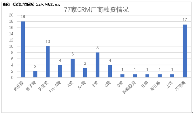 從77家CRM廠商的融資情況來(lái)看,除去17家融資情況不明確的廠商,有17家公司至今未獲投,B輪及B輪以前融資的公司有33家,占到總數(shù)的55%,相當(dāng)一部分CRM廠商還處于創(chuàng)業(yè)初期。