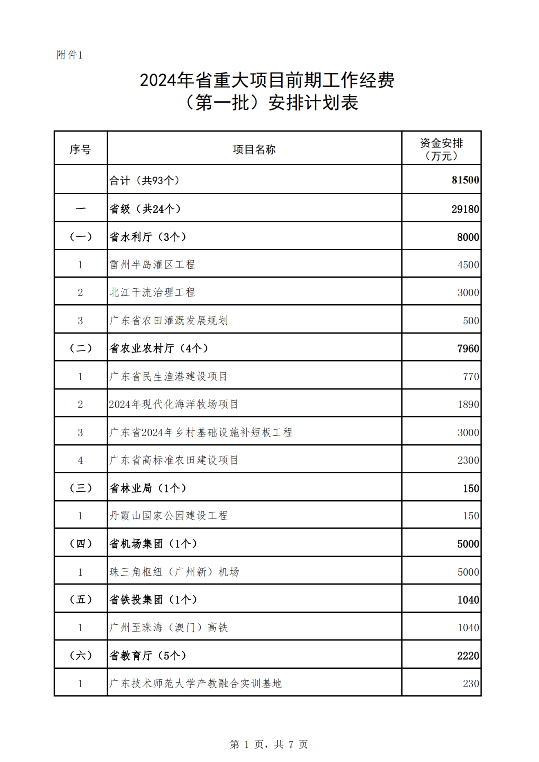 日前,廣東省發(fā)改委發(fā)布了《廣東省發(fā)展改革委關(guān)于2024年省重大項(xiàng)目前期工作經(jīng)費(fèi)安排計(jì)劃(第一批)的公示》。廣東省2024年第一批省重大項(xiàng)目93個(gè),資金安排81500萬(wàn)元。