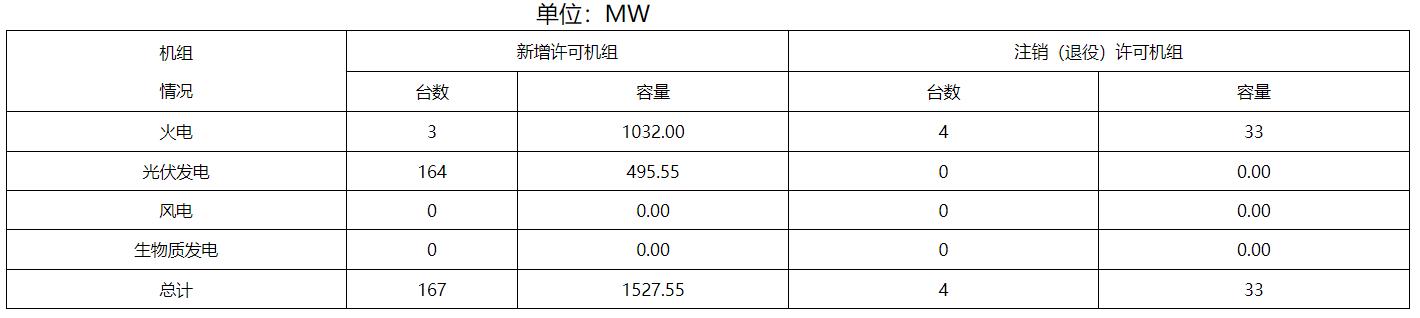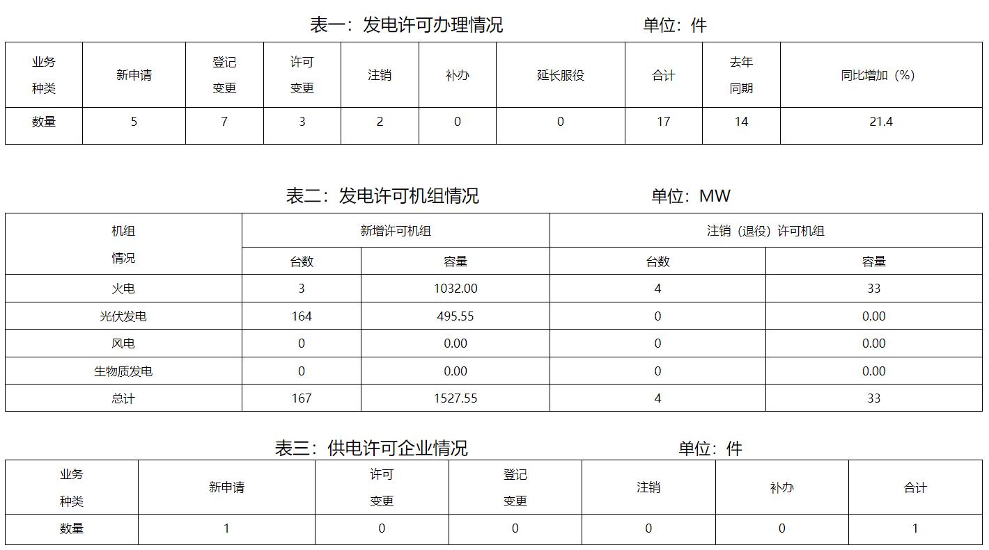 1月份,全省辦理電力業(yè)務(wù)許可證(發(fā)電類)共計17件,其中新申請5件,許可事項變更3件,登記事項變更7件,注銷2件。新增許可機組167臺(發(fā)電單元)總?cè)萘?527.55MW。