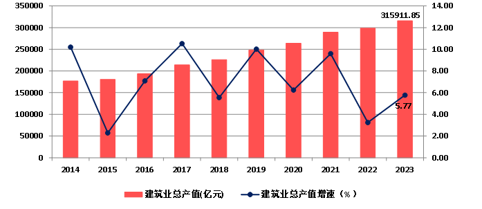 2014年以來,隨著我國建筑業(yè)企業(yè)生產(chǎn)和經(jīng)營規(guī)模的不斷擴(kuò)大,建筑業(yè)總產(chǎn)值持續(xù)增長,2023年達(dá)到315911.85億元,比上年增長5.77%。增速較上年提高2.52個百分點(圖3)。