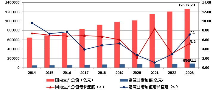 圖1 2014-2023年國內(nèi)生產(chǎn)總值、建筑業(yè)增加值及增速