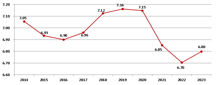 圖2 2014-2023年建筑業(yè)增加值占國內(nèi)生產(chǎn)總值比重