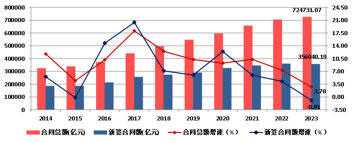 圖10 2014-2023年全國建筑業(yè)企業(yè)簽訂合同總額、新簽合同額及增速