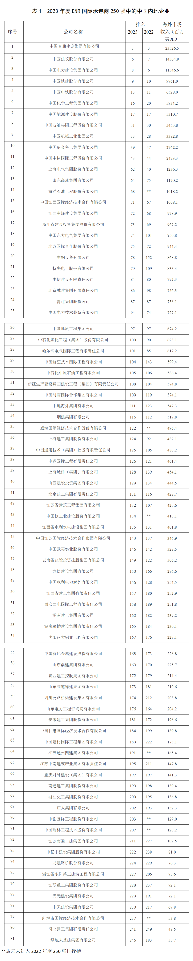 美國《工程新聞記錄》(簡稱“ENR”)雜志公布的2023年度全球最大250家國際承包商共實現(xiàn)海外市場營業(yè)收入4285.0億美元,較上年度增長7.7%,是近 10 年來罕見的增長速度。我國內(nèi)地共有81家企業(yè)入選2023年度國際承包商250強(qiáng)榜單,入選數(shù)量比上一年度增加了2家。入選企業(yè)共實現(xiàn)海外市場營業(yè)收入1179.3億美元,收入合計占國際承包商250強(qiáng)海外市場營收總額的27.5%。