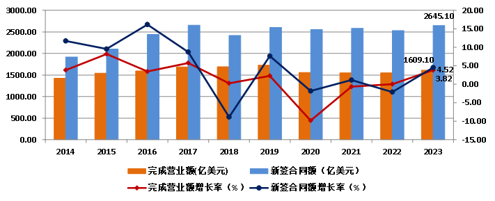 2023年,我國對外承包工程業(yè)務(wù)完成營業(yè)額1609.1億美元,比上年增長3.83%,新簽合同額2645.1億美元,比上年增長4.52%(圖14)。