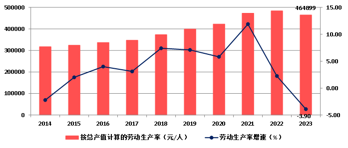 2023年,按建筑業(yè)總產(chǎn)值計算的勞動生產(chǎn)率為464899元/人,比上年下降3.90%,增速比上年降低6.14個百分點,增速連續(xù)兩年下降(圖8)。