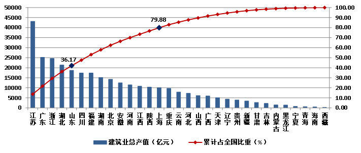 2023年,江蘇建筑業(yè)總產(chǎn)值達(dá)到43140.15億元,以絕對優(yōu)勢繼續(xù)領(lǐng)跑全國。廣東、浙江、湖北三省的建筑業(yè)總產(chǎn)值也都超過了2萬億元,分列第二、三、四位。4省建筑業(yè)總產(chǎn)值共占全國建筑業(yè)總產(chǎn)值的36.17%。除這4省外,總產(chǎn)值超過1萬億元的還有山東、四川、福建、湖南、北京、安徽、河南、江西、陜西、上海10個省市,上述14個地區(qū)完成的建筑業(yè)總產(chǎn)值占全國建筑業(yè)總產(chǎn)值的79.88%(圖15)。