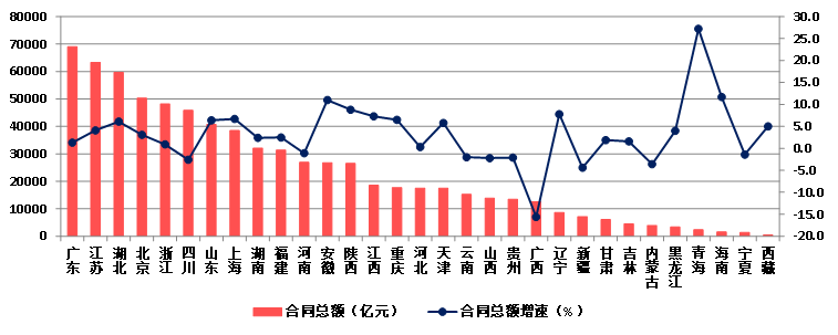 2023年,廣東建筑業(yè)企業(yè)簽訂合同總額繼續(xù)排在首位,達(dá)到68991.22億元,比上年增長1.3%;江蘇建筑業(yè)企業(yè)以63351.14億元排在第二位,比上年增長4.1%。兩省簽訂的合同總額占全國簽訂合同總額的18.26%。簽訂合同總額超過3萬億元的還有湖北、北京、浙江、四川、山東、上海、湖南、福建等8個地區(qū)。22個地區(qū)簽訂合同總額比上年增長,增速超過10%的有青海、海南、安徽等3個地區(qū),9個地區(qū)簽訂合同總額出現(xiàn)負(fù)增長,其中廣西出現(xiàn)了超過15%的負(fù)增長(圖19)。