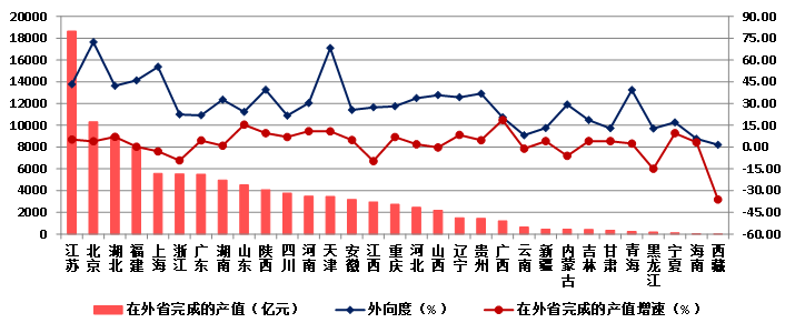 2023年,在外省完成的產(chǎn)值排名前兩位的仍然是江蘇和北京,分別為18656.62億元、10321.37億元。兩地區(qū)在外省完成產(chǎn)值之和占全部在外省完成產(chǎn)值的比重為26.99%。湖北、福建、上海、浙江、廣東5個地區(qū),在外省完成的產(chǎn)值均超過5000億元。從增速上看,23個地區(qū)在外省完成產(chǎn)值保持增長,廣西、山東、河南、天津的增速均超過10%。8個地區(qū)在外省完成產(chǎn)值出現(xiàn)下降,西藏、黑龍江分別出現(xiàn)了36.2%和15.0%的負(fù)增長。