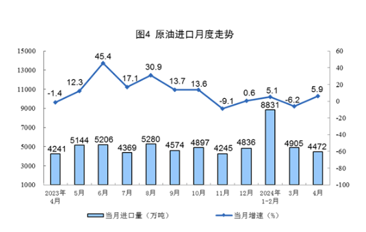原油生產(chǎn)平穩(wěn)增長,進口由降轉(zhuǎn)增。4月份,規(guī)上工業(yè)原油產(chǎn)量1747萬噸,同比增長1.3%,增速比3月份加快0.1個百分點;日均產(chǎn)量58.2萬噸。進口原油4472萬噸,同比增長5.9%。