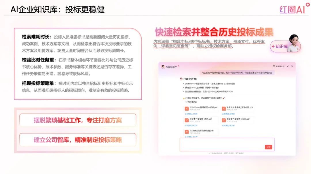 AI企業(yè)知識庫可秒級檢索并整合歷史標(biāo)書、技術(shù)方案、評委意見等資料,形成智能化投標(biāo)策略,減少人工檢索時間,提升投標(biāo)成功率。