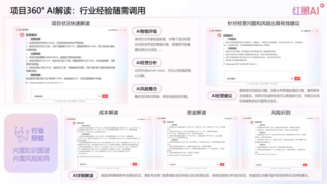 項目360°AI解讀功能可實時整合資金、成本、合同、付款等數(shù)據(jù),自動生成可視化分析報告和風(fēng)險預(yù)警,幫助企業(yè)更好地應(yīng)對政府對“全過程留痕”的監(jiān)管要求。
