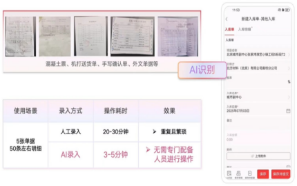 它靠大模型自動識別各類單據(jù)——混凝土票、機(jī)打送貨單、手寫確認(rèn)單,連外文單據(jù)都能秒讀。關(guān)鍵字段自動提取,合同明細(xì)自動匹配,系統(tǒng)數(shù)據(jù)自動回填,減少90%的人工操作。入庫單進(jìn)來,自動分析該掛哪個合同、哪項(xiàng)成本;結(jié)算單進(jìn)來,自動歸集實(shí)際成本,溯源到每一筆采購。以前材料員錄單錄到眼花,現(xiàn)在“掃一掃”就完事。